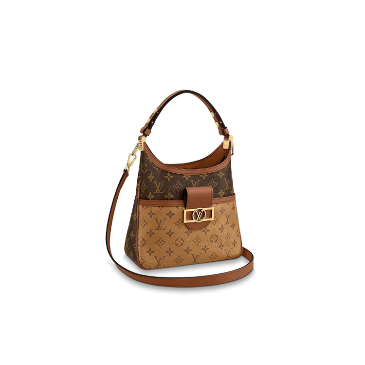 Light and practical, the Hobo Dauphine PM handbag is a functional bag, ideal for everyday use. It is made from a combination of Monogram and Monogram Reverse canvases with natural calfskin trim. The bag features an adjustable top handle, allowing hand and shoulder carry, as well as a removable leather strap for cross-body carry.