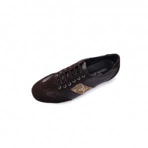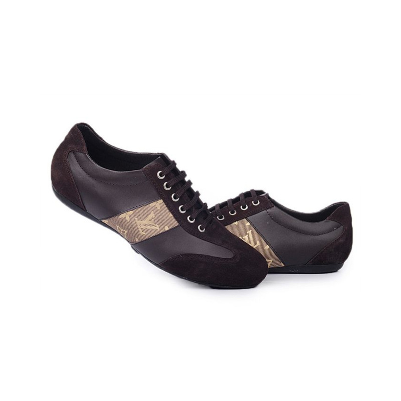 This classic sporty sneaker in a summery mix of canvas and grained calf leather features an LV-embossed natural leather strip inspired by the losine edging of Louis Vuitton trunks.