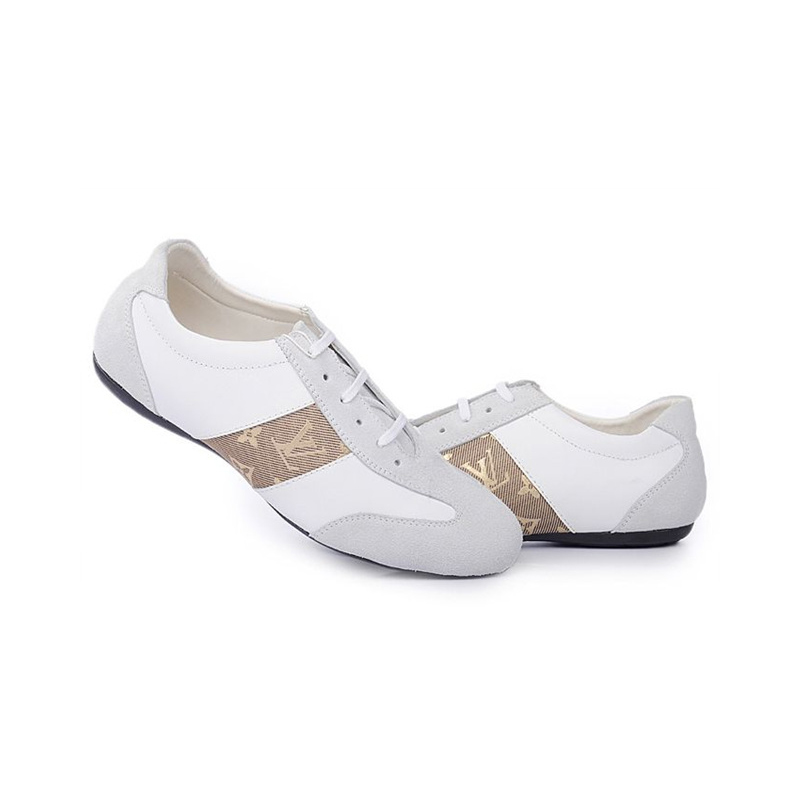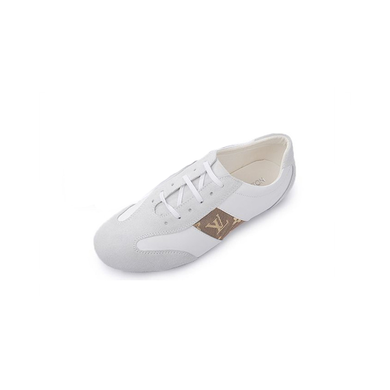 This classic sporty sneaker in a summery mix of canvas and grained calf leather features an LV-embossed natural leather strip inspired by the losine edging of Louis Vuitton trunks.