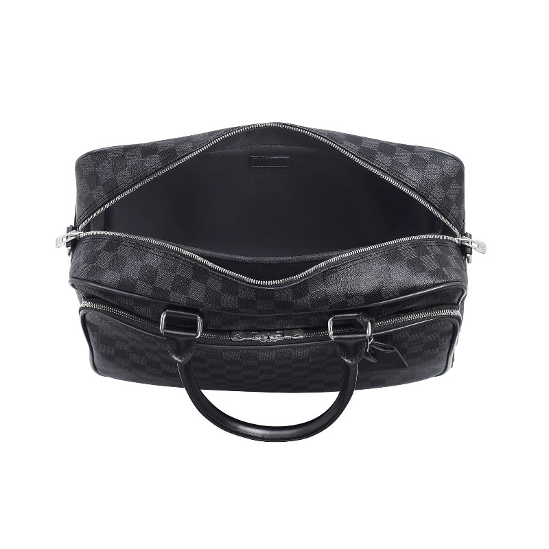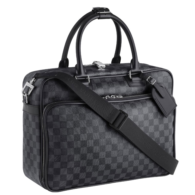 The Icare in masculine Damier Graphite canvas is ideal for business or travel. Its ample interior easily accommodates documents and a laptop, while black leather trimmings make it smart.