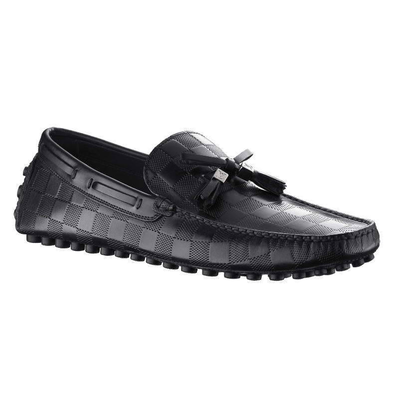 In chic Damier-embossed calf leather, this contemporary moccasin is a must-have in any wardrobe. It is accessorized with a boat shoe-style knot with LV pendants and comes on an extremely supple rubber nub sole.