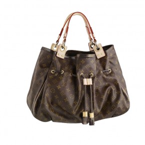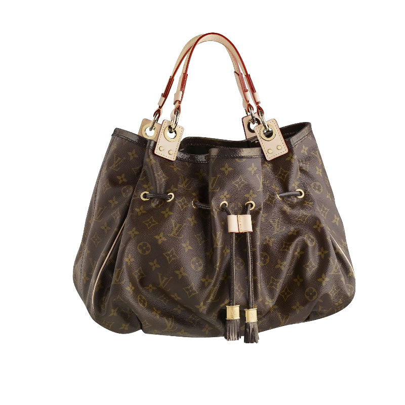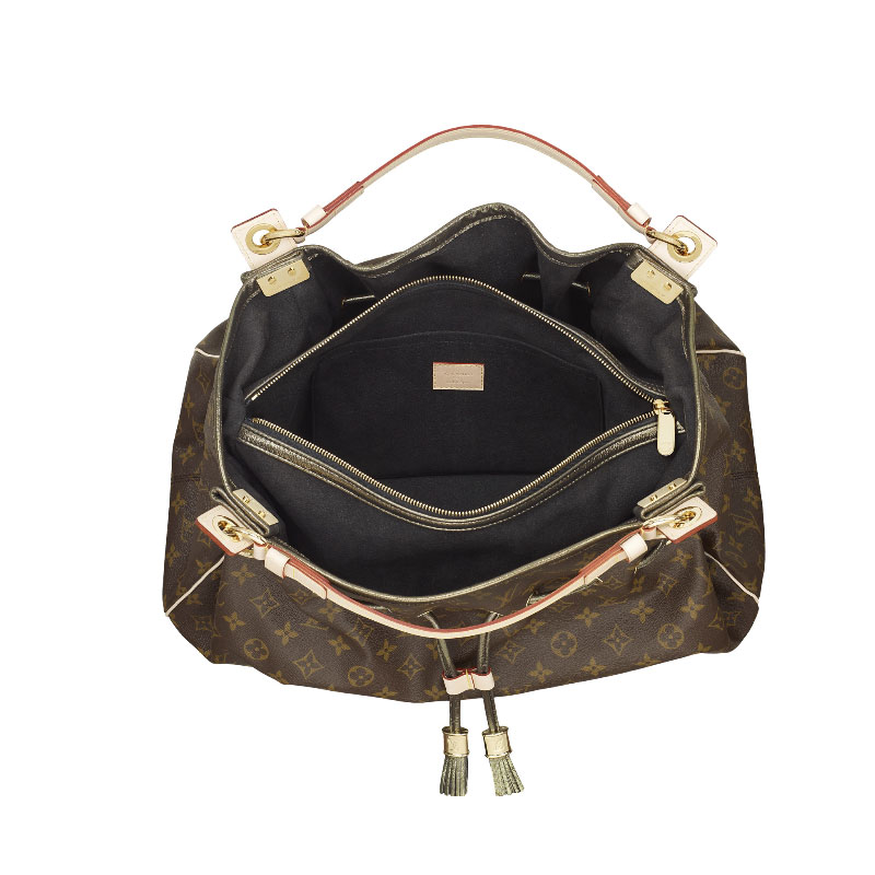 The Irene bag in House classic Monogram canvas has a metallic leather trim. It is supple and easy to wear thanks to pleating detail and a drawstring closure.