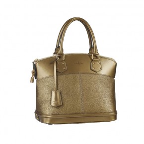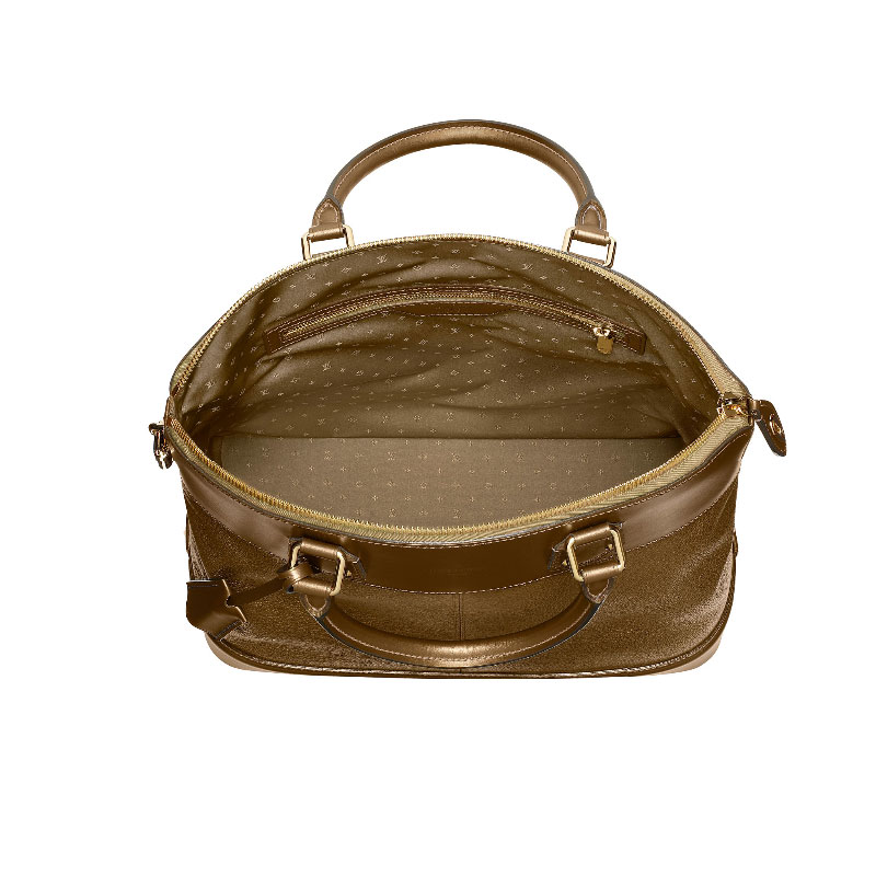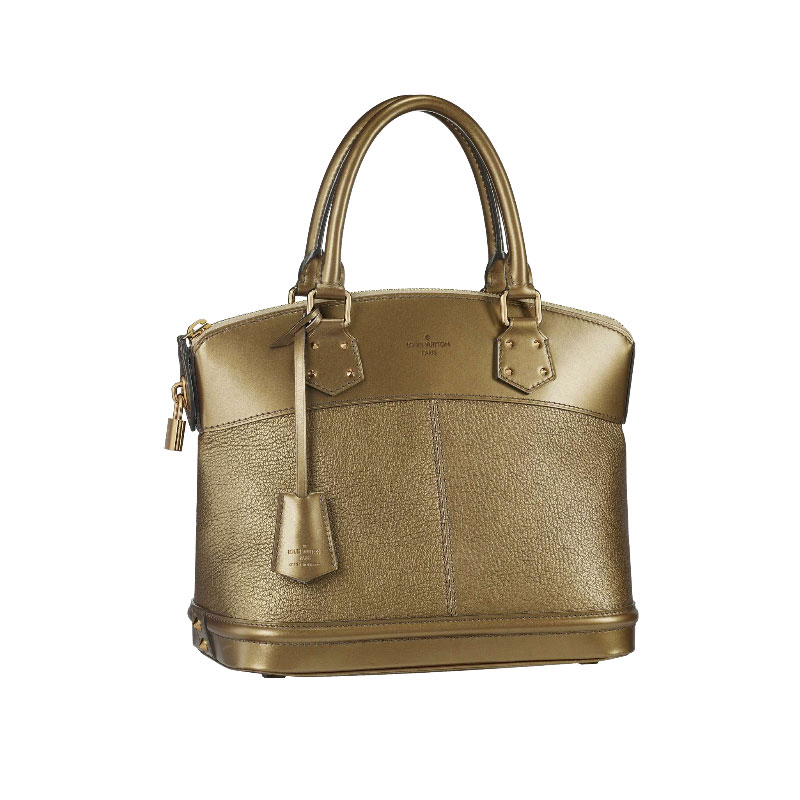 This city bag crafted in luxurious goat leather has sophisticated details reminiscent of Louis Vuitton trunks, detailing such as brass metallic pieces and contrasted stitching. A very elegant and understated hand-carry
