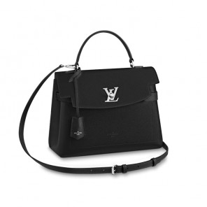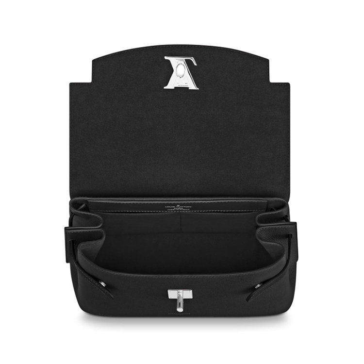 The one-handle Lockme Ever bag in soft calfskin sports a sleek, structured shape. The graphic lines of the top flap give this supple, roomy bag a modern attitude. Accented with a silver-finish LV turn lock and furnished with a leather strap for hands-free ease, it is an elegant choice for daily wear.