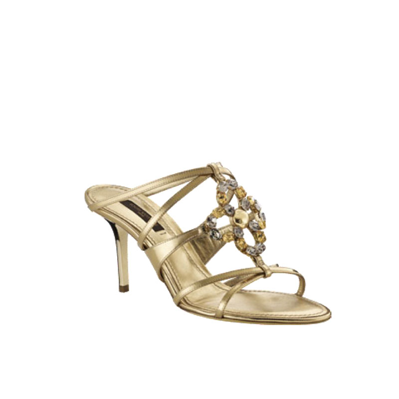 Louis Vuitton introduces jewels for feet with these fabulous strappy mules in metallic gold leather embellished with a glittering strass-encrusted Monogram flower.