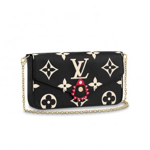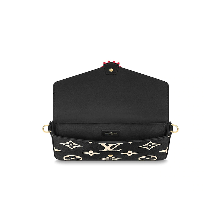 This special edition of the versatile Pochette F茅licie is part of the LV Crafty special edition of accessories, leather goods and ready-to-wear. Black Monogram Empreinte leather is printed with the giant Monogram pattern, creating a graphic bicolor effect, while the pouch's press-stud closure is highlighted with a colorful, craft-inspired detail.