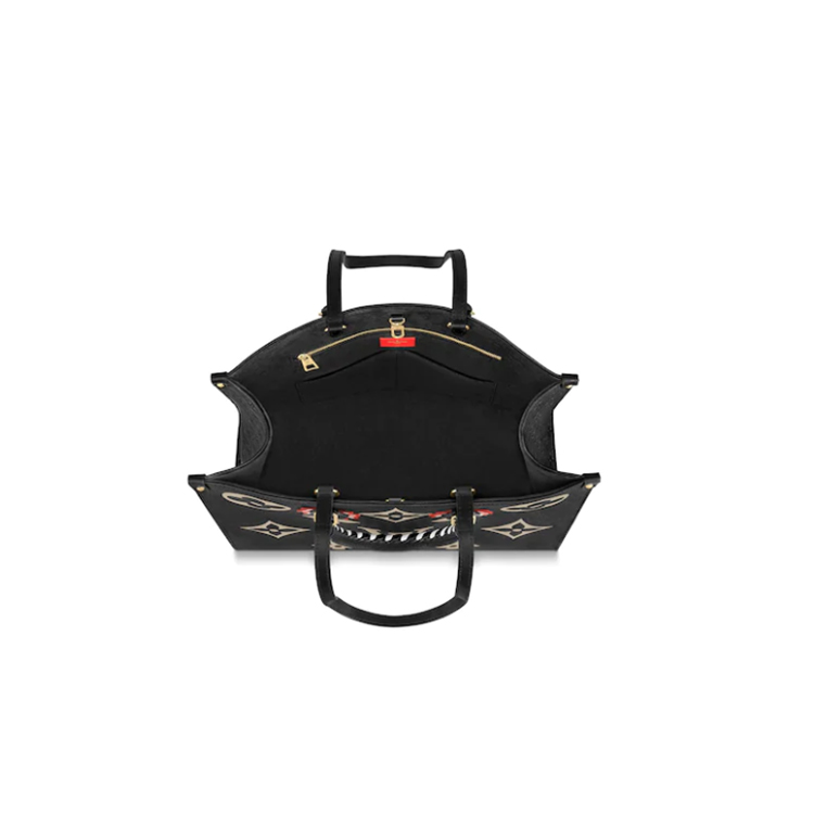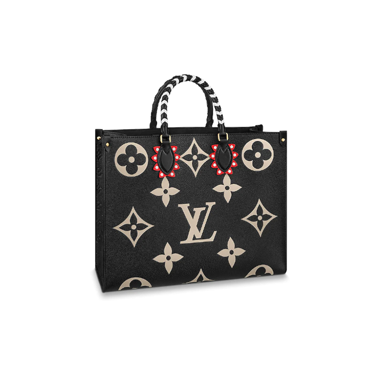 The OnTheGo GM tote bag in embossed leather is adorned with an oversized version of the iconic Monogram pattern. Braided top handles and eye-catching detailing around the handle mounts bring a touch of the street to this bag. The roomy interior, with its numerous inside pockets, make it perfect for everyday wear.