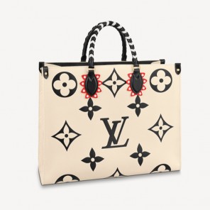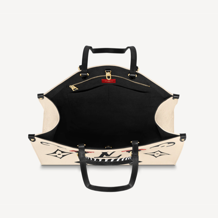 The OnTheGo GM tote bag in embossed leather is adorned with an oversized version of the iconic Monogram pattern. Braided top handles and eye-catching detailing around the handle mounts bring a touch of the street to this bag. The roomy interior, with its numerous inside pockets, make it perfect for everyday wear.