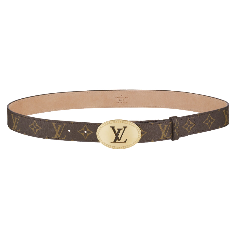 This casual chic belt in iconic Monogram canvas is accessorized with a feminine oval buckle cut with the LV logo and engraved with a motif inspired by the lozine edging of Louis Vuitton trunks.