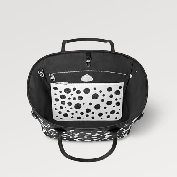 The new Louis Vuitton x Yayoi Kusama collection is a monument to art and fine craftsmanship. The renowned Japanese artist is known for her signature use of dots as a symbolic evocation of infinity. The LVxYK Neverfull MM features a galaxy of white dots on lustrous black Monogram Empreinte cowhide. An ultra-functional tote, it comes with a removable pouch and a pumpkin-shaped charm, a reference to another of Kusama鈥檚 emblems.