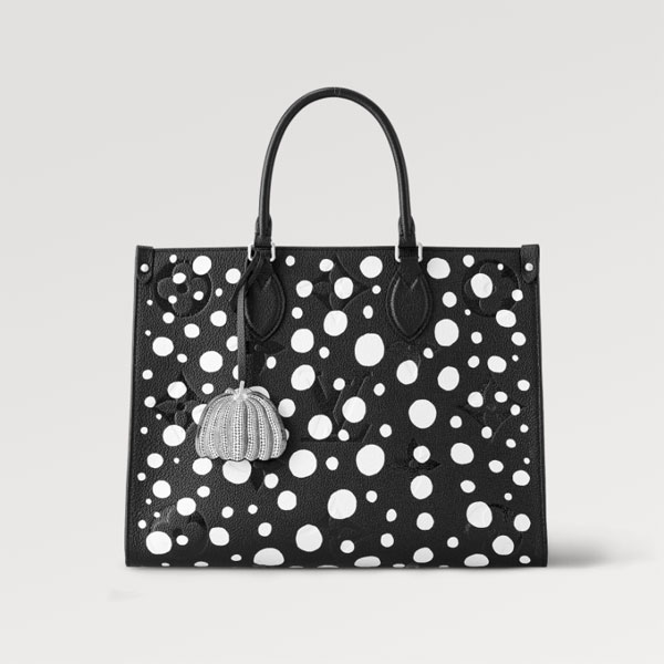 For the major new Louis Vuitton x Yayoi Kusama collection, the LVxYK OnTheGo MM comes decorated with the Japanese artist鈥檚 most recognizable signature: repetitive arrays of dots, a symbol of infinity. Dazzling white dots are printed on grained black cowhide embossed with one of the House鈥檚 own signatures, the iconic Monogram pattern. This spacious, practical tote comes with a charm shaped like a pumpkin, another recurrent theme in Kusama鈥檚 work.