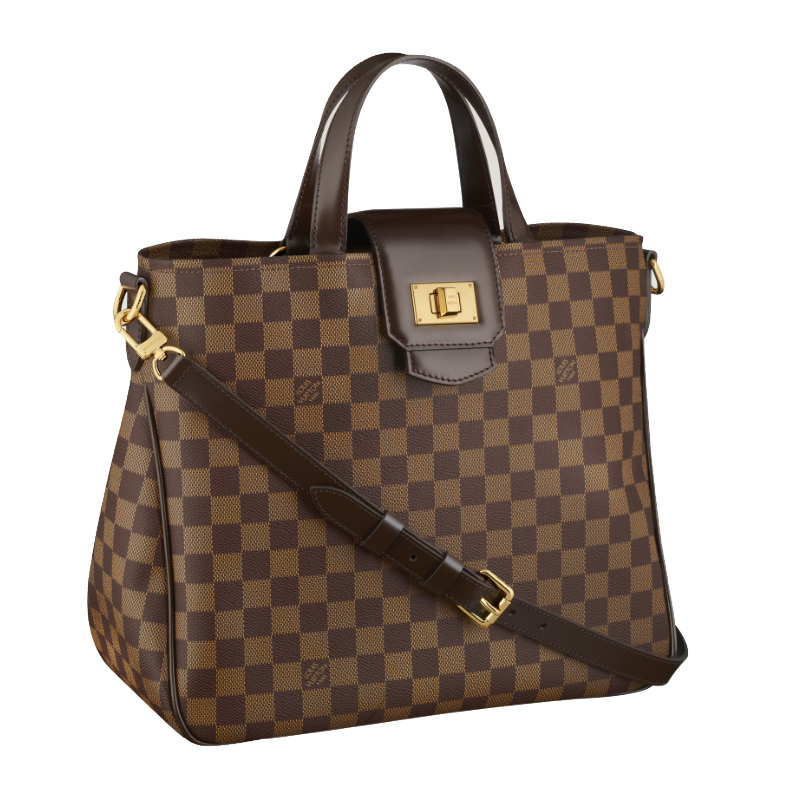 The versatile cabas rosebery in Damier Ebene canvas embodies the understated elegance of the house.With a bold golden brass twist lock,it's just as chic worn on the shoulder as carried by hand