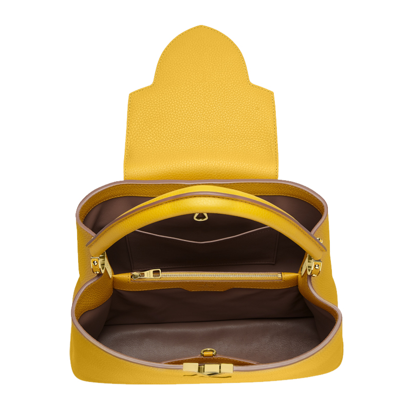 Taking its name from the rue des Capucines in paris,where Louis Vuitton opened his first store in 1854,the timelessly elegant Capucines bag is a testament to fine leather craftsmanship.In full-grain Taurillon leather,it combines refined details,including a semi-rigid handlesecuredbyjewel-like rings,with a spacious,functional shape offering two ways:outside to revealthe outline of a Monogram flower,or inside to show the LV initials.