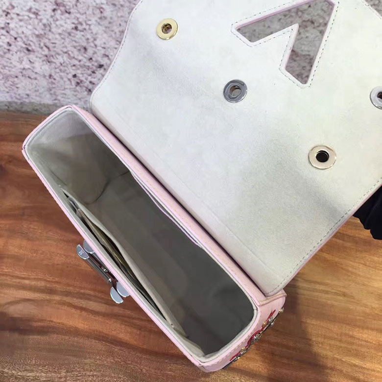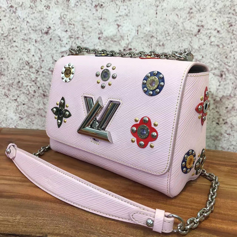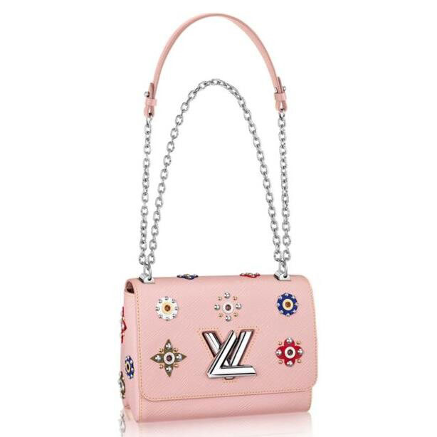 Twist Mechanical Flowers reinterprets the Monogram Flowers through a mix of materials and high craftsmanship. Flowery leather patches are delicately applied on Epi leather base and embellished by 14 eyelets & 122 golden or silver colour studs both engraved with Louis Vuitton signature. This creation brings a fashionable appeal to must-have Twist bag.