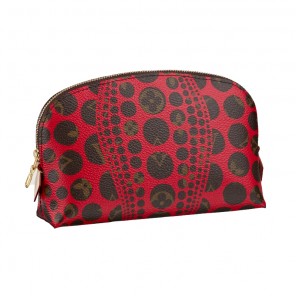 As a travel kit or a handy accessory in any city bag,the cosmetic pouch is an essential item.with the addition of yayoi kusama's bold monogram pumkin dots design,it's also a very striking one.