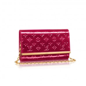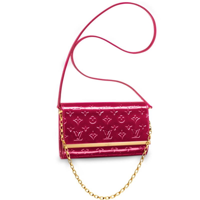 In rich colors and glossy Monogram Vernis leather, this fashionable clutch can be carried in different ways thanks to its golden chain and removable long leather strap. Its flap, equipped with a secure magnetic closure, is highlighted by a sophisticated Louis Vuitton-engraved metal plaque.