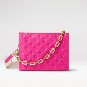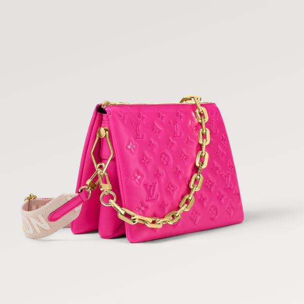 The Coussin PM handbag is made from puffy lambskin with the Monogram motif embossed into the leather. Inside the bag, there are two compartments separated by a zipped pocket. Its chunky gold-color chain and wide textile strap – both detachable – enable multiple carry options.