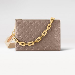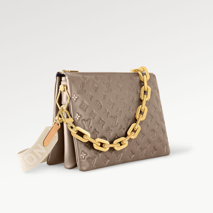This season, the body-friendly and ultra-comfy Coussin MM handbag is made from Monogram-embossed puffy lambskin in a timeless grey hue with gold-color hardware. A wide textile strap enables comfortable all-day cross-body wear while the removable chunky chain allows under-arm and baguette carry. Inside, the Coussin features three separate compartments.