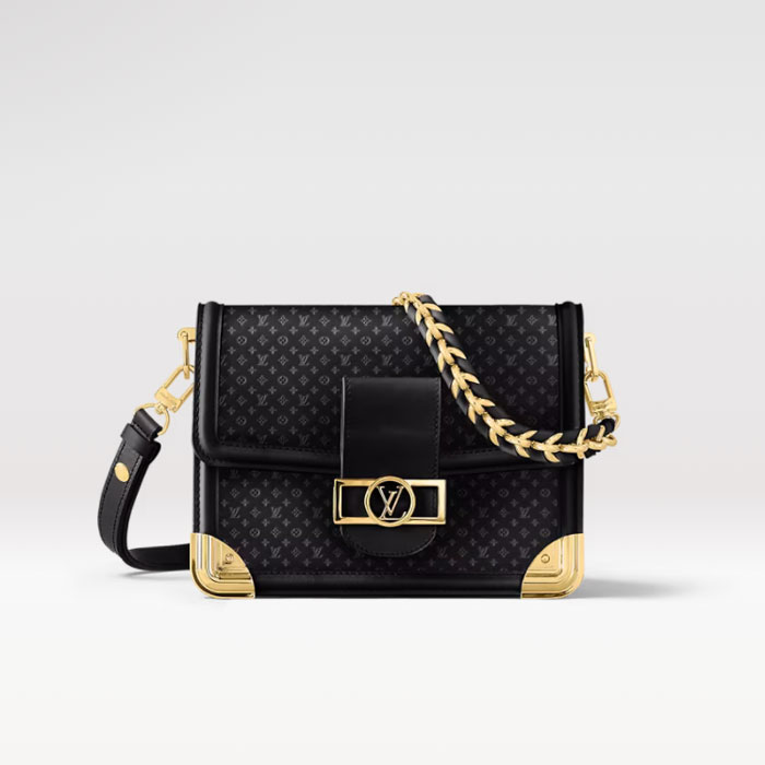 This Dauphine MM handbag is made from supple calfskin with the new nano-size Monogram pattern embossed and then printed in a subtly contrasted color on the leather. Practical features such as two interior compartments and a detachable, braided leather-chain strap make it a perfect everyday companion. This Dauphine is fashioned with shiny metallic corners and angle brackets that echoes Louis Vuitton's trunkmaker DNA.