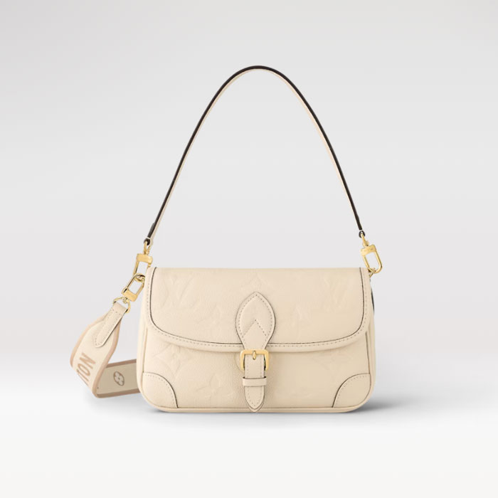The Diane satchel is made from Monogram Empreinte, the Maison鈥檚 signature embossed leather. Fitted with a detachable leather strap for shoulder or hand carry, as well as a wide and removable jacquard cross-body strap with a woven "Louis Vuitton", this versatile bag can be styled in chic or sporty fashion, to match an ensemble or a mood.