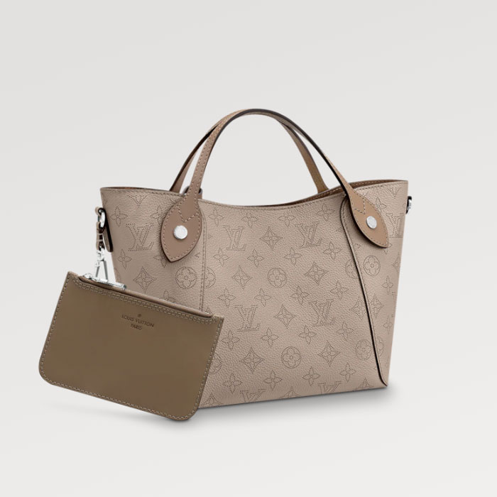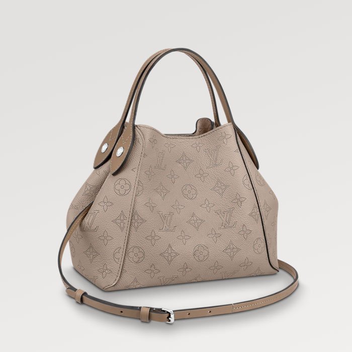 Two bags in one: with its sides gathered in and fastened, the Hina PM is an on-point bucket model; opened wide, it becomes a small casual tote. Made from perforated Mahina calf with calf-leather trim, this model is light and comfortable to carry, either by the two top handles or cross-body on the detachable strap.