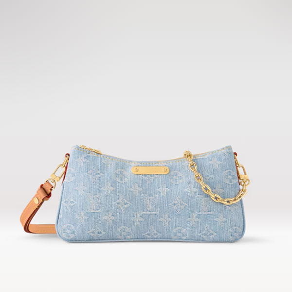 The Liv pochette is revisited in bleached and stonewashed Monogram denim for a vintage look and a summery feel. Designed to sit snugly under the arm, this small bag comes with a removable chain in gold-tone metal and a removable, adjustable strap in aged natural leather. It is signed with a Louis Vuitton-engraved plaque.