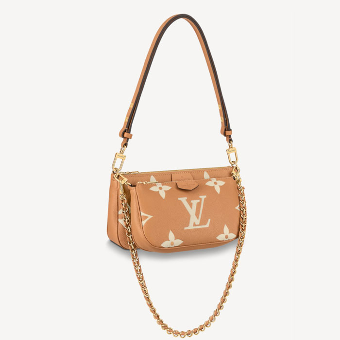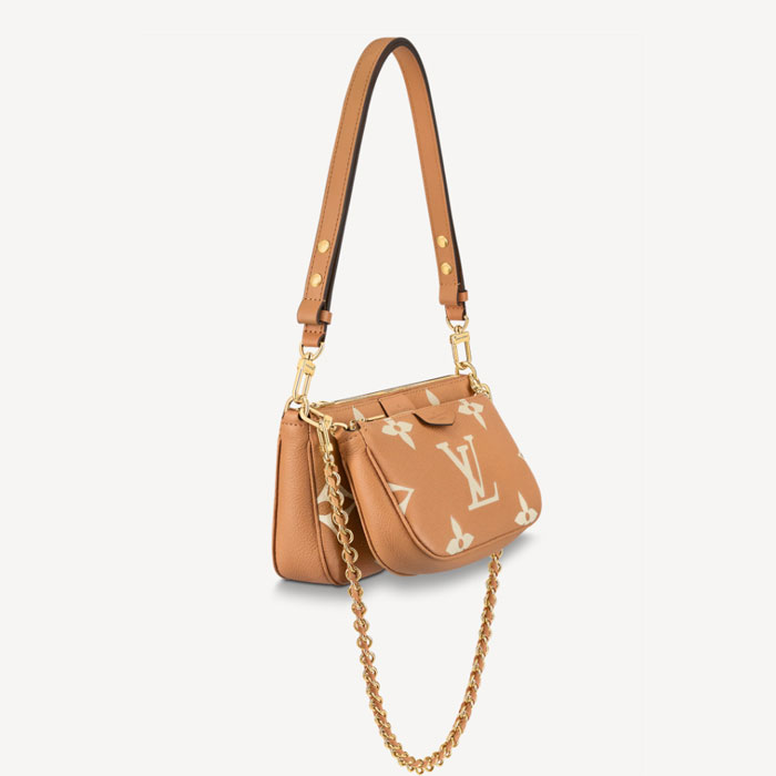 The Multi Pochette Accessoires cross-body bag is fashioned from Monogram Empreinte leather with a warm bicolor colorway that brings out the Monogram Flowers and LV Initials embossed and printed on the cowhide. This hybrid bag combines a Pochette Accessoires with a removable Mini Pochette Accessoires. There鈥檚 a detachable gold-color chain with leather braiding and a removeable shoulder strap.
