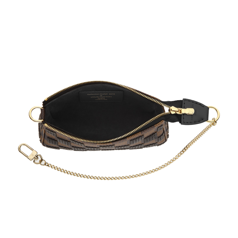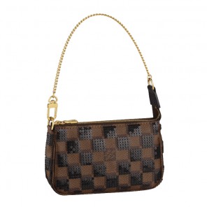 Inspired by the geometric spirit of Louis Vuitton's Spring/Summer 2013 fashion show, the essential Mini Pochette Accessoires in Damier canvas is reinterpreted as Damier Paillettes. Intricately embroidered with colored sequins and swinging from a golden chain handle, it becomes a sophisticated, glamorous accessory for evening.