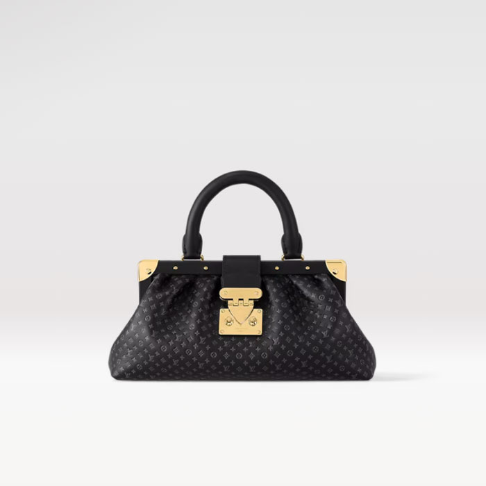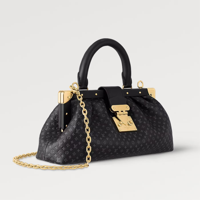 Part of the new Nanogram capsule, the Monogram Clutch is offered in supple calfskin, embossed with a whimisically proportioned Monogram pattern for a subtle two-tone effect. When the rotating handle mounts are tucked inside the bag, they become invisible, turning this bag into an elegant hand-carry purse.