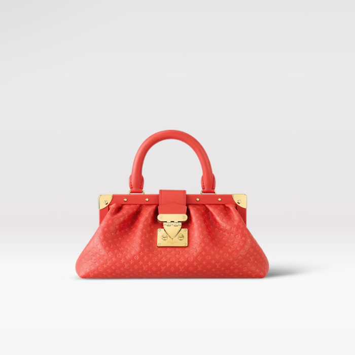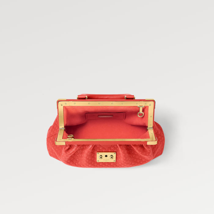 Part of the new Nanogram capsule, the Monogram Clutch is offered in supple calfskin, embossed with a whimisically proportioned Monogram pattern for a subtle two-tone effect. When the rotating handle mounts are tucked inside the bag, they become invisible, turning this bag into an elegant hand-carry purse.
