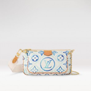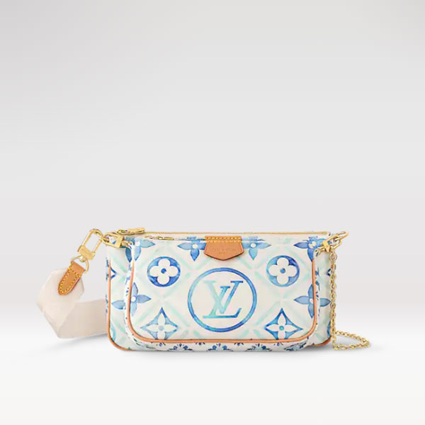 Made from summery Monogram Tiles canvas for the LV By The Pool Collection, the Multi Pochette Accessoires is two zipped pouches that clip together for a hybrid twist on the classic handbag. A wide removable and adjustable textile strap and gold-color chain enable different looks and carry options.