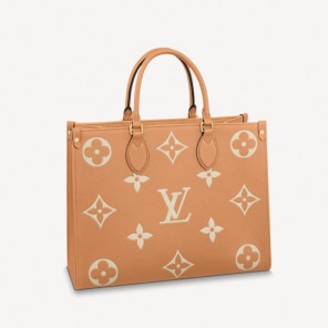 Made from Monogram Empreinte grained leather in a warm two-color combination, this OnTheGo MM tote bag features the Monogram pattern embossed and printed onto the leather. Its boxy shape means it鈥檚 roomy and can easily fit a laptop. It has two leather top handles for hand carry as well as two long shoulder straps.