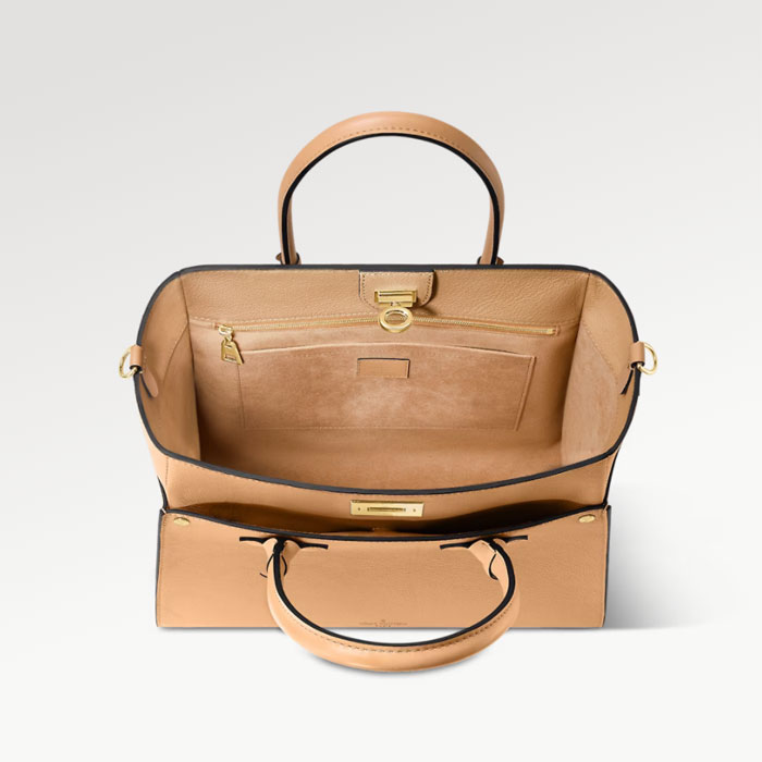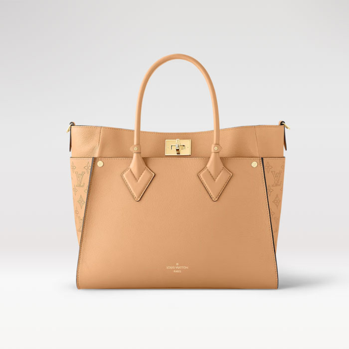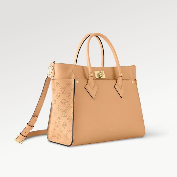 The generously sized On My Side GM handbag is made from calf leather with perforated calf leather on the sides, featuring the Monogram motif. Like all the On My Side bags, it closes with the signature turn lock. Two top handles, and a removable and adjustable leather strap, offer multiple carrying options.