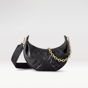 The Over The Moon delights with its versatile shape in quilted calf leather. The embroidered puffy Monogram pattern brings a statutory feel while the adjustable strap and gold-color chain deliver a myriad of carry options: elbow, short shoulder, cross-body, and long shoulder. With the strap removed, it can even be carried as an evening clutch.