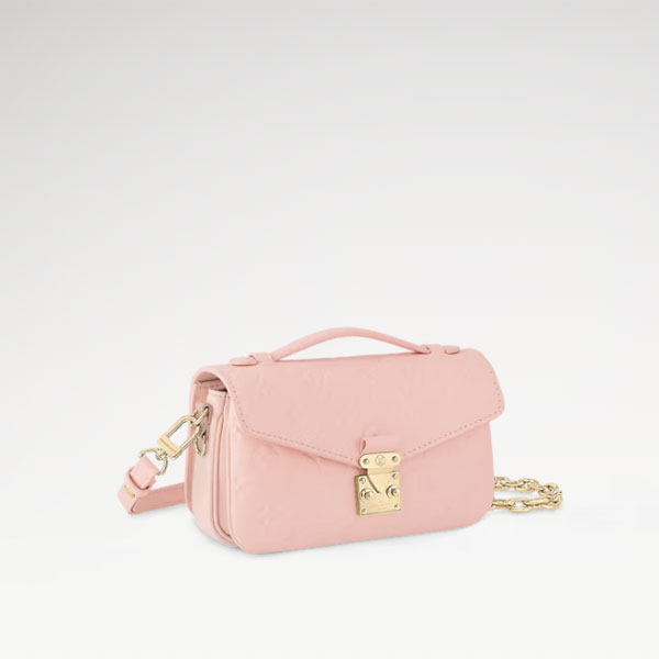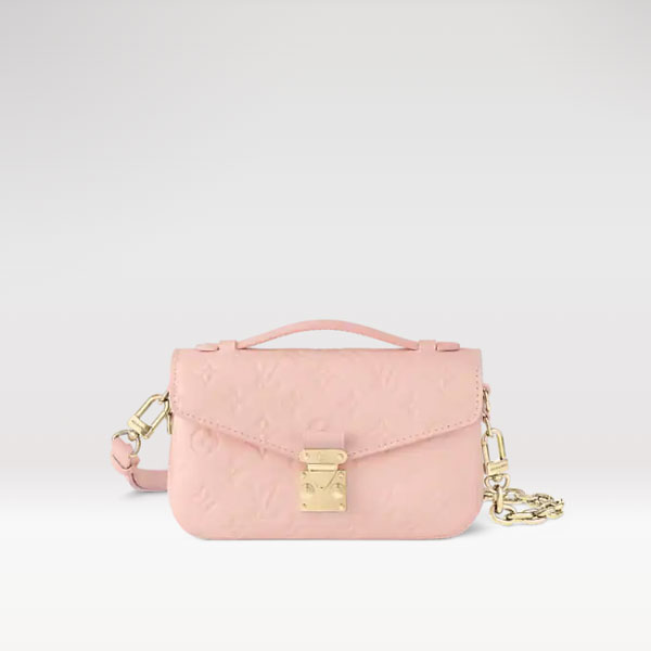 The stylish East-West silhouette of this Pochette Metis handbag is crafted from pastel-toned Monogram Empreinte leather, with the Monogram motif embossed into the cowhide. The iconic S-lock and removable short chain, both with a pale golden finish, emphasize the bag鈥檚 fashionable edge. Its organized interior and adjustable smart strap make it practical.