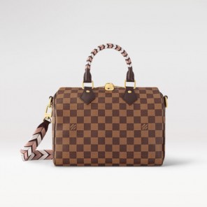 The Speedy 25 handbag greets the new season adorned with beautiful braided trim. Woven from pink- and cream-colored leather, the Toron handles and cross-body strap bring a fresh, feminine touch to the iconic Damier Ebene canvas. Gleaming gold-tone hardware adds the finishing touch to this classic city bag, an ideal choice for daily use.
