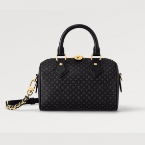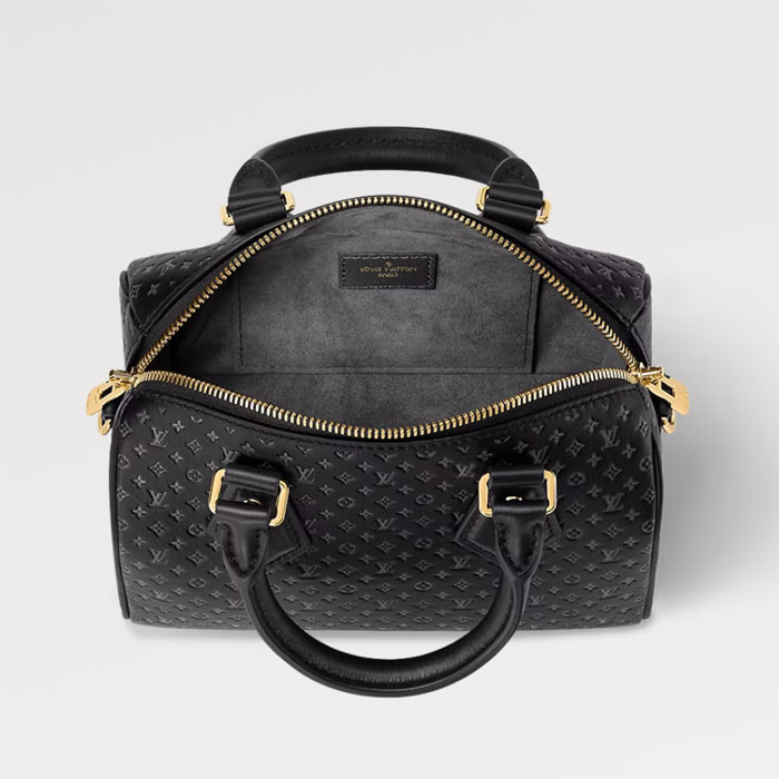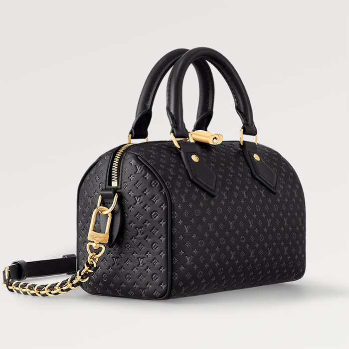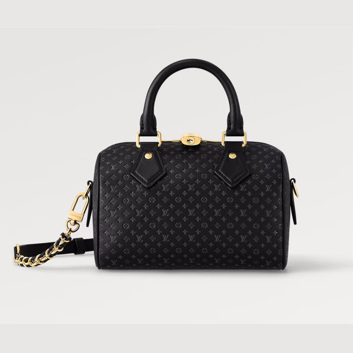 Fashioned from calfskin with a very small Monogram motif embossed then printed on the leather, this Speedy 20 handbag is part of the Nanogram capsule. Its inimitable silhouette, and engraved padlock, make this bag instantly recognizable. A removable and adjustable braided-chain-and-leather strap enables shoulder or cross-body carry.
