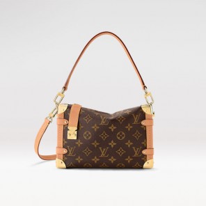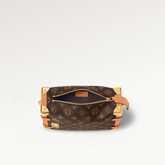 Returning to the House鈥檚 trunkmaking beginnings, Nicolas Ghesqui猫re creates the Side Trunk PM handbag in Monogram canvas with leather trim. What strikes the eye is the singularity of the leather zip tab fitted with the iconic S-lock and the reinforced metallic corners. The wide top handle is removable as is the thin leather shoulder strap.