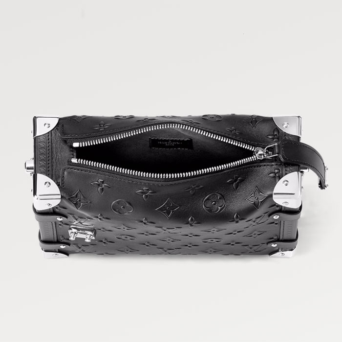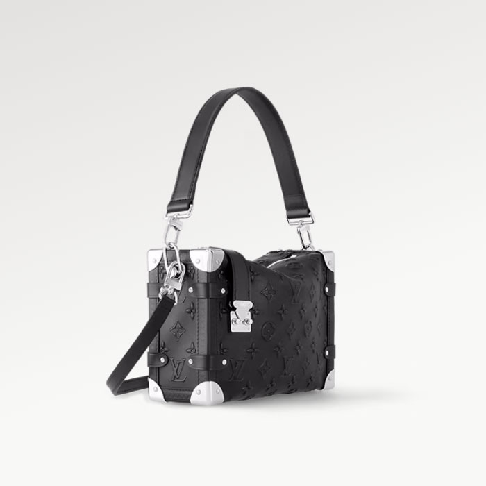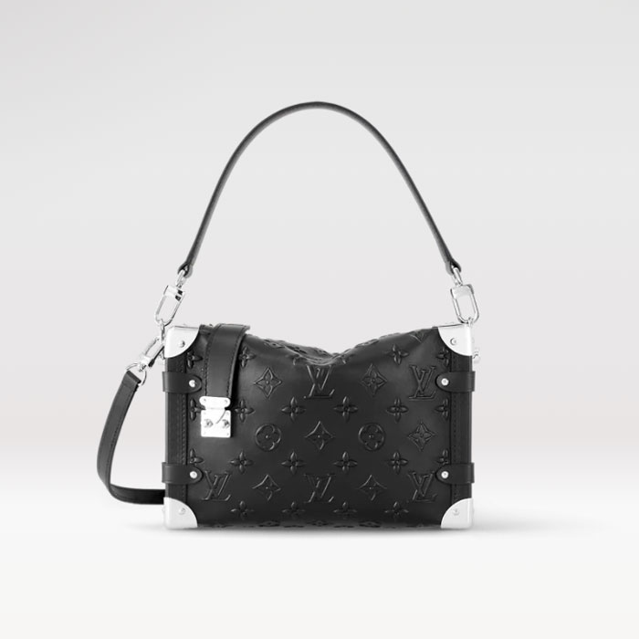 Nicolas Ghesqui猫re twists the iconic Petite Malle into a new body-friendly shape featuring all the codes of the traditional trunk: the Side Trunk PM handbag. Made from Monogram-debossed, calfskin leather, the Side Trunk features a side S-lock and metallic corners. A wide top handle and a thin adjustable strap, both detachable, enable a variety of carries.