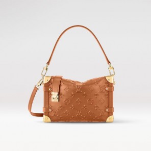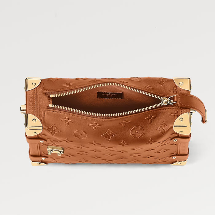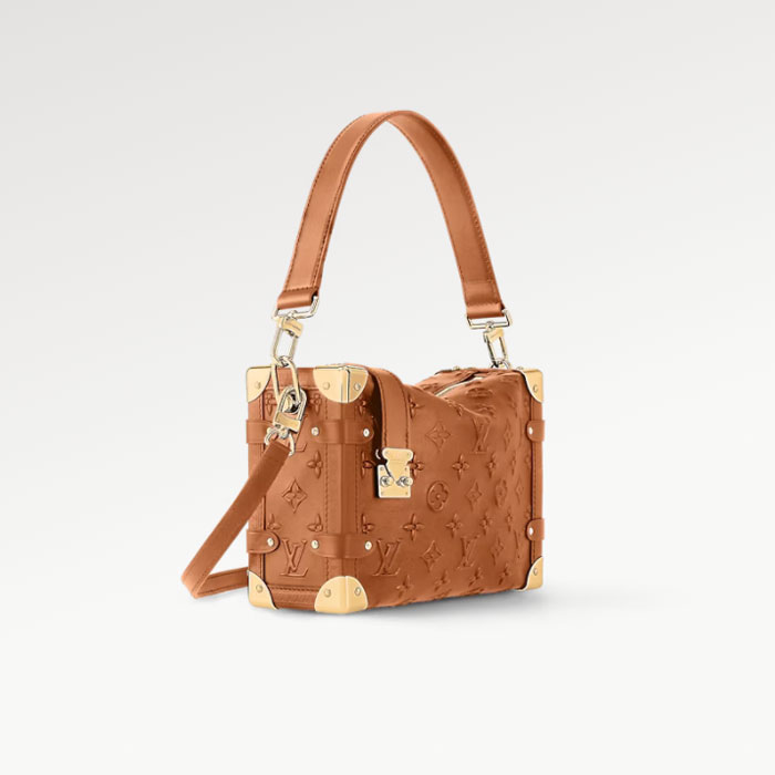 Nicolas Ghesqui猫re twists the iconic Petite Malle into a new body-friendly shape featuring all the codes of the traditional trunk: the Side Trunk PM handbag. Made from Monogram-debossed, calfskin leather, the Side Trunk features a side S-lock and metallic corners. A wide top handle and a thin adjustable strap, both detachable, enable a variety of carries.