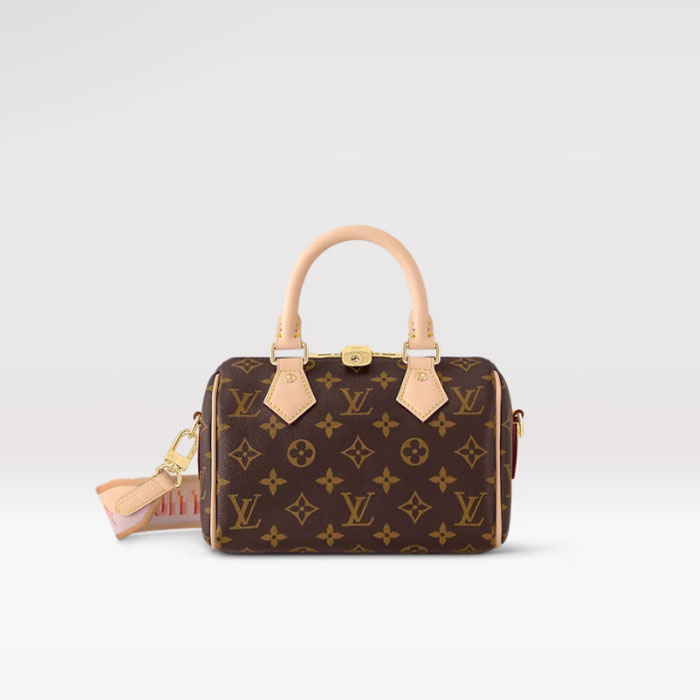 The Speedy Bandouliere 20 hand bag takes on classic Louis Vuitton allure in Monogram canvas with natural cowhide-leather trim and gold-color hardware. Inspired by the House鈥檚 emblematic travel bag, its distinctive shape is adorned with two rolled-leather top handles, padlock. A detachable strap with seasonal fresh pink and orange accents, signed Louis Vuitton, enables shoulder and cross-body wear.