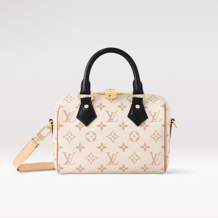This edition of the iconic Speedy 20 Bandouli猫re handbag displays the new Monogram Dune canvas, introduced at Cruise 24. Soft yet strong, the sand-inspired colorway is enhanced by Toron handles in black leather and a detachable strap in natural cowhide. Gleaming golden hardware, including a signature padlock, finishes this effortlessly stylish city bag.