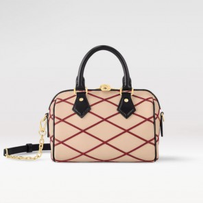 This finely crafted edition of the Speedy 20 Bandouli猫re handbag is fashioned from luxe beige lambskin, embellished with the House鈥檚 iconic Malletage pattern in contrasting deep red. In addition to its Toron top handles, this model is fitted with a removable chain-and-leather strap, for enhanced versatility. The double zip closure is ornamented with a signature golden padlock.