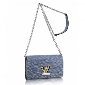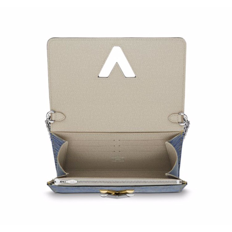 Inspired by the Spring-Summer 2015 Collection, this practical chain wallet with its playful Twist turn-lock and trendy Epi denim boasts all the essential functionalities. It can be worn as an elegant evening bag, either cross-body or over the shoulder