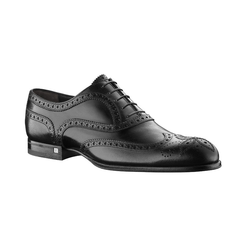 This timeless business shoe in fine waxed calf leather features beautiful curved lines, perforations and Monogram flower stitching on the toe cap.