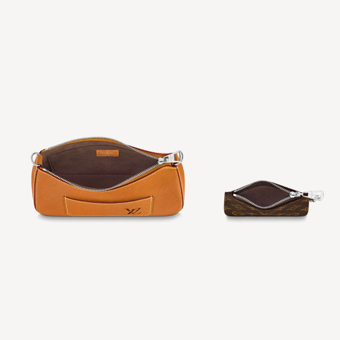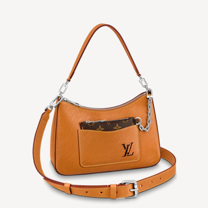 The Marelle handbag is fashioned from grained Epi leather with a detachable canvas pouch that sits in an outside pocket and is attached to the bag with a chain. The Marelle can be carried by hand, elbow or shoulder with its detachable top handle, or worn as a cross-body thanks to its removable and adjustable leather strap.