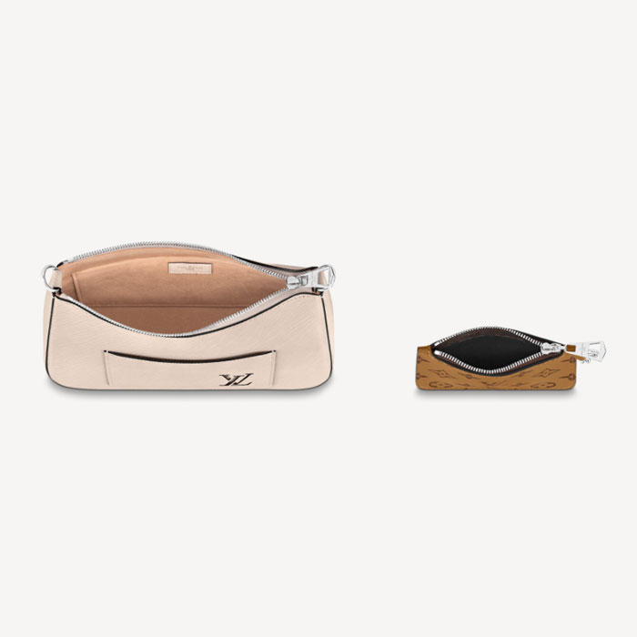 The Marelle handbag is fashioned from grained Epi leather with a detachable canvas pouch that sits in an outside pocket and is attached to the bag with a chain. The Marelle can be carried by hand, elbow or shoulder with its detachable top handle, or worn as a cross-body thanks to its removable and adjustable leather strap.