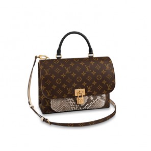 The Marignan handbag is a refined version of the classic messenger model, with a top handle and an adjustable strap for hands-free carry. This edition combines Monogram canvas with luxurious natural python skin and smooth leather trim. A timeless signature piece, it is finished with an engraved gold-tone metal plate and LV padlock.