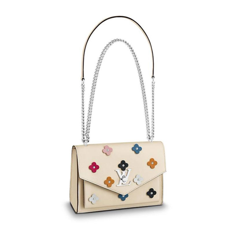 For Summer ’18 the Mylockme BB is embellished with a shower of colorful blooms, inspired by the iconic Monogram Flower. The leather blossoms are fastened to the soft calfskin with metal rivets, echoing the bag’s silver-finish LV Twist lock.