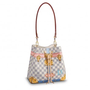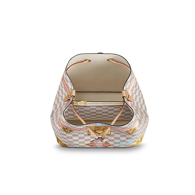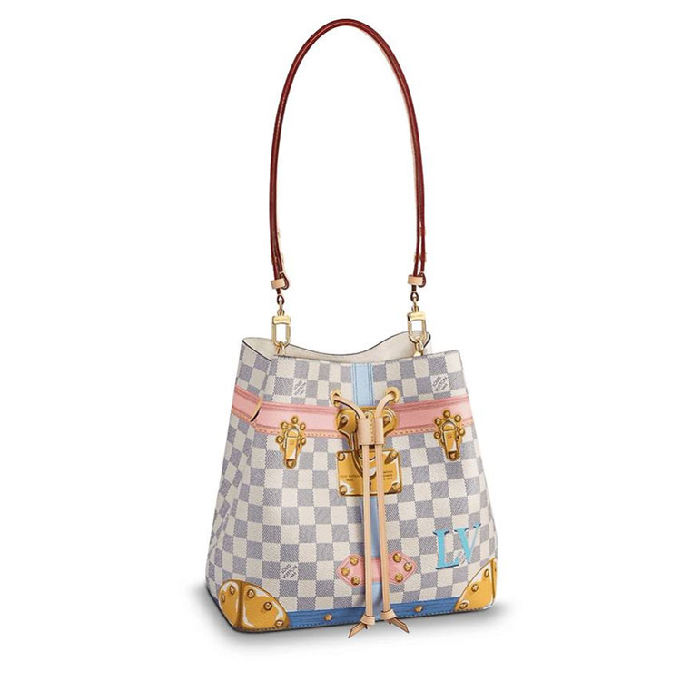 The NeoNoe is an on-trend bucket bag with an adjustable strap that lengthens for a modern, cross-body carry. The trompe l'oeil screen prints of trunk corners and historic locks that adorn the supple Damier Azur canvas make this version a playful twist on LV heritage.